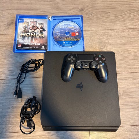 Playstation 4 med to kontrollere og spill selges.