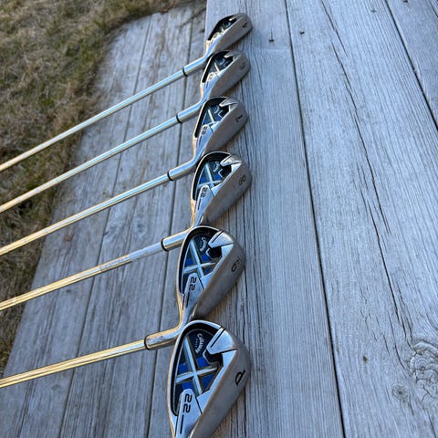 Callaway X18 jernsett bestående av jern 4, 5, 6, 7, 8, 9, PW og SW. Fult jernsett for deg som ønsker å starte å spille golf. Køllehodene er i metall med cavity back-design, laget for å gi tilgivende treffflate. Skaftene er stålskaft. Ny Golf Pride grep som er brukt en sesong.