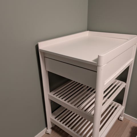 Liewood stellematte i beige farge plassert på hvitt stellebord. Stellematten har strukturert overflate og rektangulær form som dekker toppen av bordet. Stellebordet har en åpen hylle under til oppbevaring av bleier, kluter og annet stelleutstyr. Egnet til bruk på barnerom eller bad som fast stelleplass for baby.