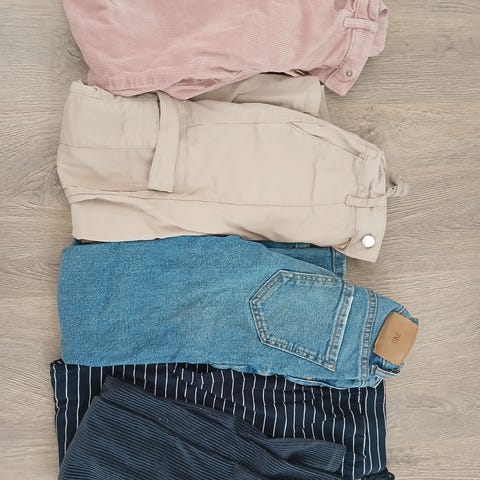3 bukser med hull på knærne kan medfølge. Se eget bilde. Alle med hull på et ben.