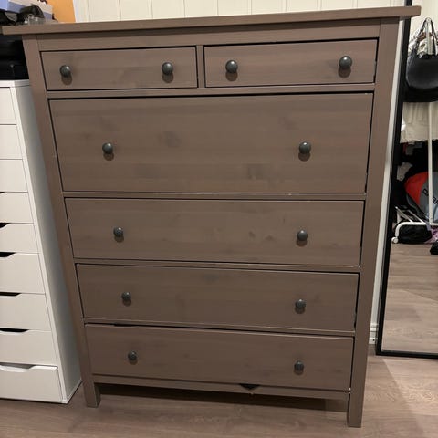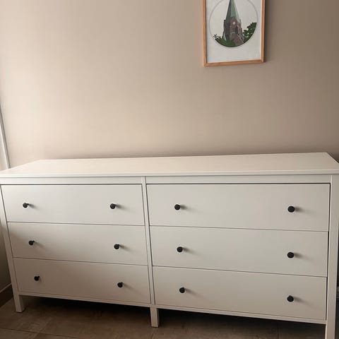 Hvit Hemnes kommode med 8 skuffer selges billig da jeg må bli kvitt den. Den står i boden i underetasjen. Den må derfor bæres en etasje opp (ikke heis her).