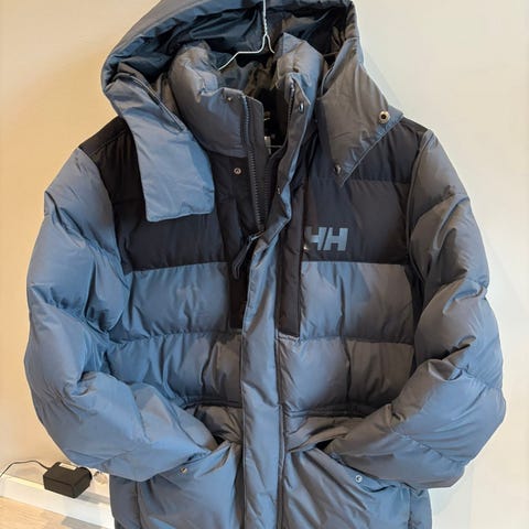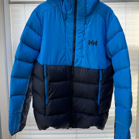 Helly Hansen dun vinterjakke for herre i størrelse L. Jakken er blå og fylt med dun.