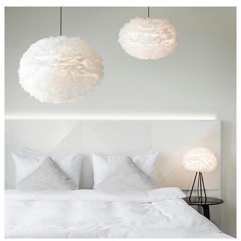 Veldig fin taklampe i fjær, perfekt til barnerom (sky lampe), soverom eller for å lune et rom. Kan velge selv hvilken styrke på pæren for å lage ønsket belysning. Må hentes :)