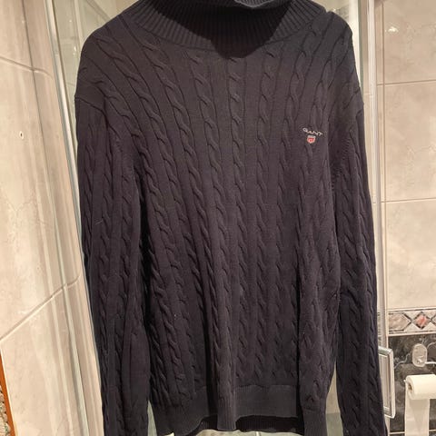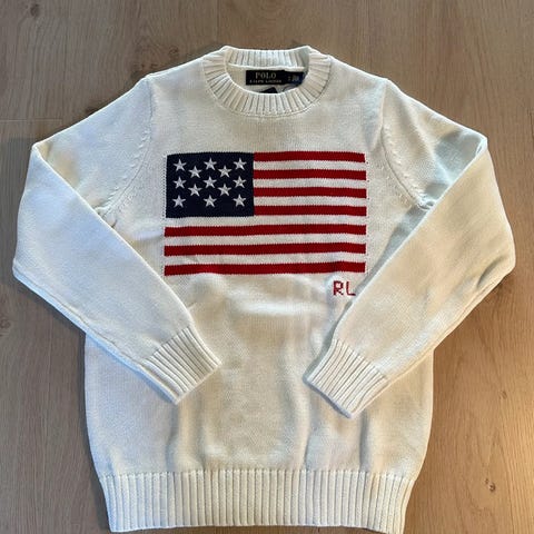 Hvit GANT strikkegenser for herre i størrelse XXL. På brystet er det amerikanske flagget, og brodert Gant New Haven. Ligner på Polo Ralph Lauren sin tilsvarende genser.