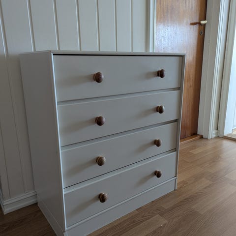 Kommoden er godt brukt og har synlige bruksmerker og slitasje (se bilder), men den er fortsatt stabil og fungerer fint til oppbevaring. Knottene er litt forskjellige, men kan enkelt byttes hvis man ønsker et nytt uttrykk.