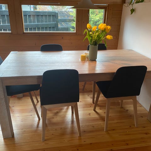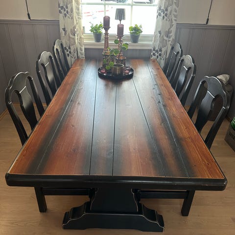 Stor spisestue med 8 stoler og ileggesplate, noe bruksmerker