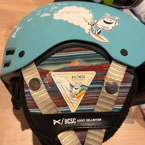 Bern Muse hjelm i størrelse L (57–59 cm). Hjelmen er blå med hvitt fuglemotiv og har myk, grå innside for økt komfort. EPS-innmat for støtdemping. Justerbar hakereim med klips.