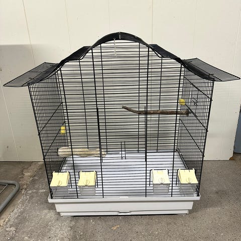 Stort fuglebur i hvitt metall. Buret har rette sider og tett gitter, egnet for mindre og mellomstore burfugler. Det følger med flere trepinner/sittepinner og noen plastkopper til mat og vann. Nederst er det en uttrekkbar bunnskuff som gjør rengjøring enklere. Buret har frontåpninger for tilgang til innsiden. Egner seg til innendørs bruk for for eksempel parakitter, undulater eller andre lignende småfugler, avhengig av behov og plasskrav.