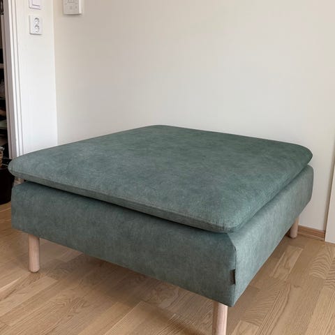 Kan både brukes som puff inntil eksisterende sofa, frittstående puff eller inntil vegg med puter i ryggen som en ekstra lenestol/sofa.
