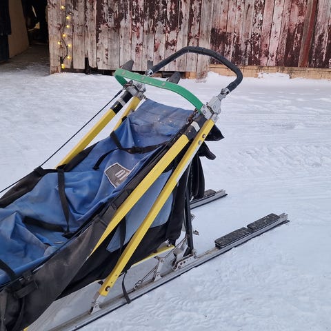 Sammenleggbar nomeslede laget i aluminium vurderes solgt. Selden er litt høyere enn gjennomsnittlig, så ekstra behagelig for litt høyere hundekjørerer. Dette er en solid slede. Kan følge med solud sledetrekk, anker og/ eller sledebelegg for lite tillegg i pris