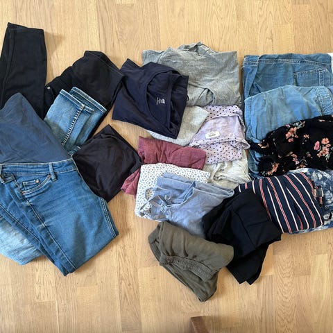 Pent brukte gravidklær som også er supre etter fødsel. 3 denim bukser, 1 joggebukse, 2 lette sorte ankelbukser, 3 sorte tights, 1 sort treningstights , 2 shorts, 3 singletter, 2 topper, 3 gensere. Str S og M.
