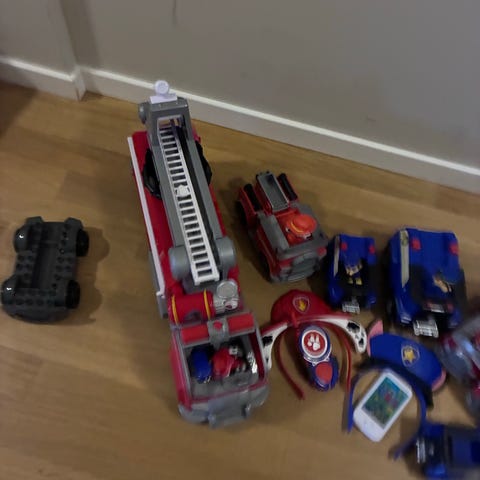 Sett med flere kjøretøy og figur fra Paw Patrol-universet. Leker som dette passer til rollelek og fantasilek for barn som liker serien og karakterene. Kjøretøyene kan brukes hver for seg eller sammen som et sett i ulike lekescenarioer inspirert av Paw Patrol.