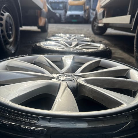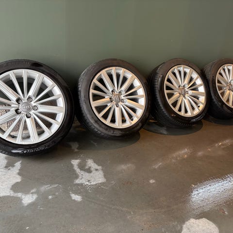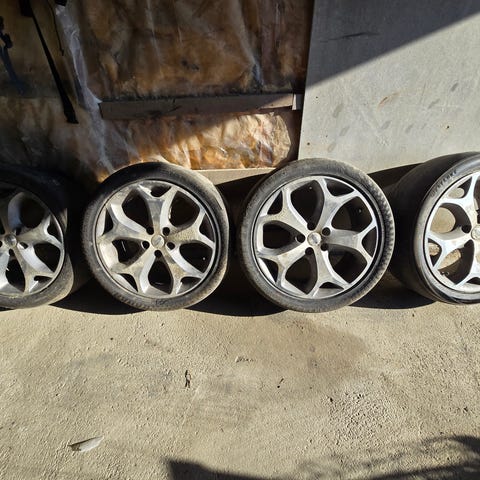 Selger komplett 19 tommer hjulsett til Tesla Model 3 med sommerdekk. Dekkene har ca. 6–7 mm mønsterdybde igjen