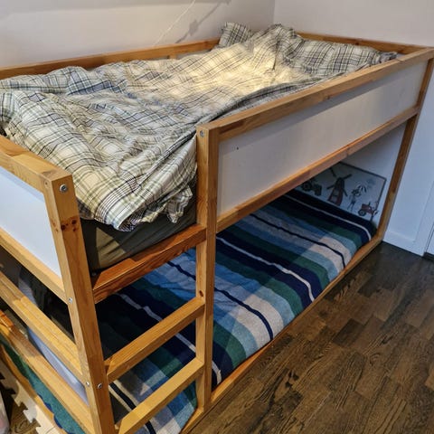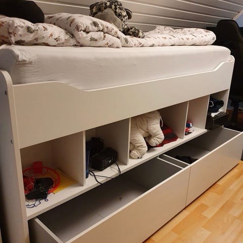 Sengen er demontert på en slik måte at den enkelt kan skrus sammen, men da med sengen nede. Skal den skrus sammen hvor sengen er oppe må den demonteres enda mer og skrus sammen på en annen måte. Det følger ikke med madrass.