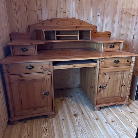 Stødig skrivepult brukt til hjemmekontor. 120cm x 60, høyde 74. Noe bruksmerker, kan lett beises/males.
