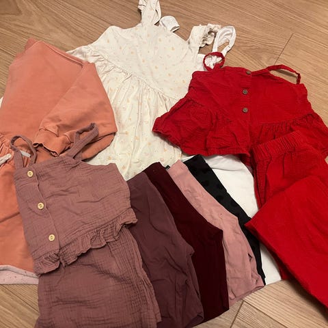 Inneholder 6x sommerkjole i Jersey, 1 bomull rosa kjole fra Lindex ( kjøpt med anmerkning -se bilde), 3 gensere, 7 t-skjorte, 1 shorts, 1 leggings, 1 bommul sett med topp og bukse, 1 pas sandaler Wheat str 27 (NB! Store i størrelsen) og par blinke sportssko i str 29 med Elsa ( lite brukt). Har merker fra navnelappene.