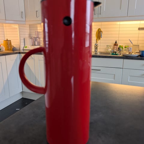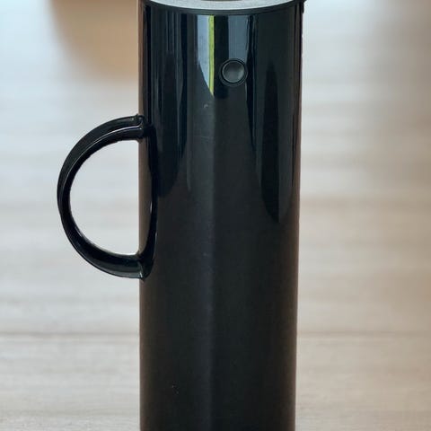 Stelton termokanner i hvit og svart. Klassisk sylinderformet design med hank på siden og lokk med helletut. Egnet til servering av varme og kalde drikker på kjøkken, spisebord eller kontor. Selges som sett med to kanner i ulike farger. Den hvite har kun vært til varmt vann. Selges gjerningspersonen hver for seg. 150,-