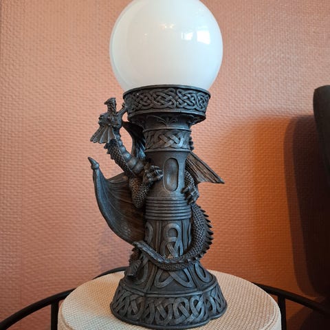 Håndutskjært dragelampe/lampe i orientalsk stil med mange detaljer. Mørkt treverk som blir nydelig når det oljes. Treverket måler 67 cm. Kjøpt i Kashmir på 60-70 tallet, sannsynligvis mye eldre. Et raskt bildesøk på google gir mer informasjon om verdi og mulig historikk. Tatt med til Norge av en FN-soldat med sans for slikt. En skatt som dessverre ikke passer inn i vår stil. Treverket nederst på ene siden har sprukket litt, se bilde. Befinner seg i Tromsø.