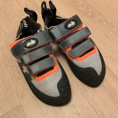 Klatresko med borrelås i svart, blå og grønn farge.. Overdelen er i tekstil/syntetisk materiale med justerbar stropp og hempe bak for enkel av- og påtaking.