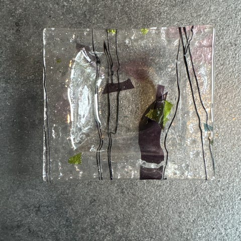 Kvadratisk dekorfat i glass med rød bunnfarge og abstrakt mønster i svart og grått. Fatet har lett buede kanter og en blank overflate på oversiden, med mer strukturert overflate på undersiden. Moderne uttrykk med tydelig grafisk og kunstnerisk stil.