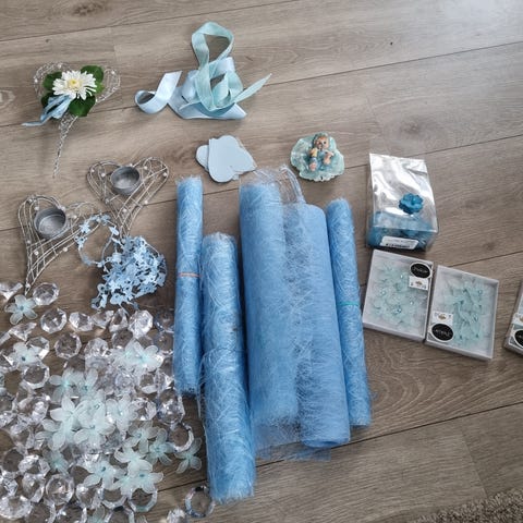 Bordpynt til dåp. Blå sommerfugler, duk med glitter og knall bon bon