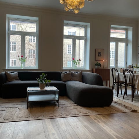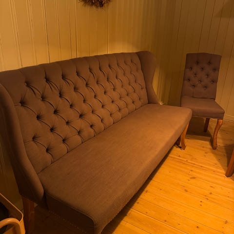 Flott strøken 4 seter spisestuesofa i mørk grå velourstoff. Enkel å holde ren. Kjøpt ny i 2023. Ikke dyr/røyk. Ny pris 22.000 på tilbud den gang. Kjøpt på Skeidar. Merke: Town. Sittehøyde 50 cm.