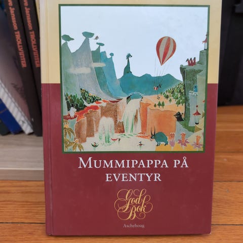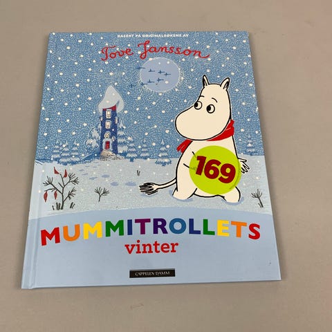 Illustrert barnebok om Mummitrollet og vennene hans, med fargerike tegninger på omslaget og inne i boken. Innbundet utgave med ryggen trukket i blått stoff og illustrert for- og bakside. Tekst på norsk.
