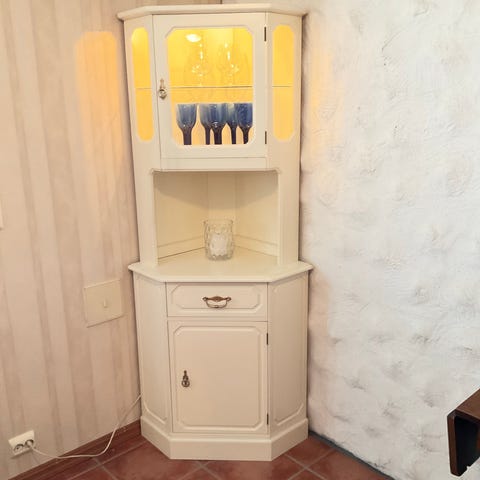 Retro hjørneskap med glassdør og montert lys. Dekorativt og praktisk til oppbevaring.