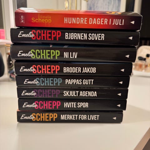 Bokpakke med krimbøker av Emelie Schepp i serien om Jana Berzelius. Pakken inneholder blant annet titlene «Merket for livet», «Hvite spor», «Skult agenda», «Pappas gutt», «Ni liv» og «Broder Jakob». 2 av bøkene er innbundet og de andre 4 er paperback, tilhører samme krimserie.