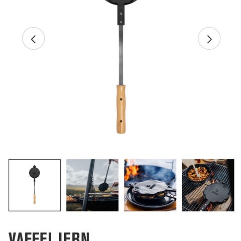Støpejern vaffeljern for bruk over bål eller åpen flamme. Jernet har to runde plater med rutemønster for tradisjonelle vafler. Langt skaft med trehåndtak gir avstand til varmen ved bruk. Egnet til tur, hytte og utendørs matlaging der man har tilgang til bål eller grill.