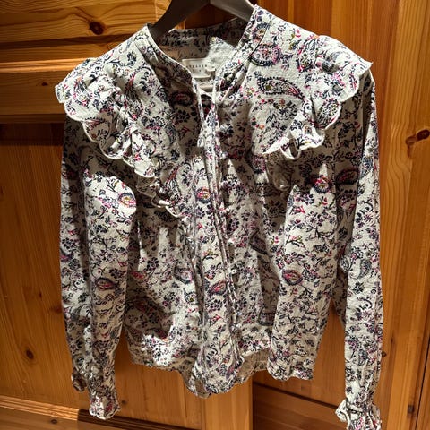 Nydelig bluse med mellomblått mønster. Korte, vide ermer.