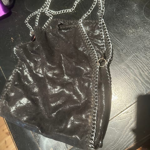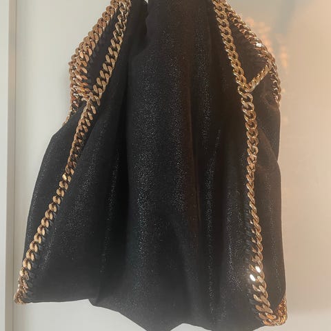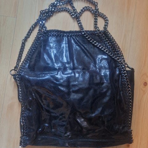 Original Designer Stella McCartney Falabella skulderveske i lys grå kunstlær til dame. Vesken har karakteristiske sølvfargede kjededetaljer langs kantene og dobbel kjederem som kan bæres både på skulderen og i hånden. Modellen kan foldes over for en mer kompakt fasong. Kunstlærmaterialet er mykt med lett struktur. Egnet som hverdagsveske eller til enklere penere antrekk, med plass til nødvendigheter som lommebok, mobil og småting.