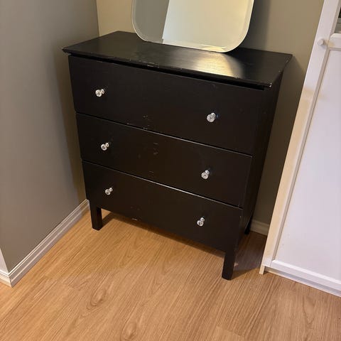 Malm kommode godt brukt. Hel og skuffer fungerer. Den er spraymalt sort og ser den trenger litt omsorgs på toppen. Men fortsatt mye kommode igjen