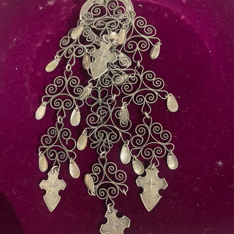 . Brosjen er laget i sølv med filigransarbeid og hengende ledd som gir et tradisjonelt uttrykk. Den har nål og lås på baksiden for feste på klær eller bunadsplagg. Stemplet med sølvstempel 830 på baksiden.
