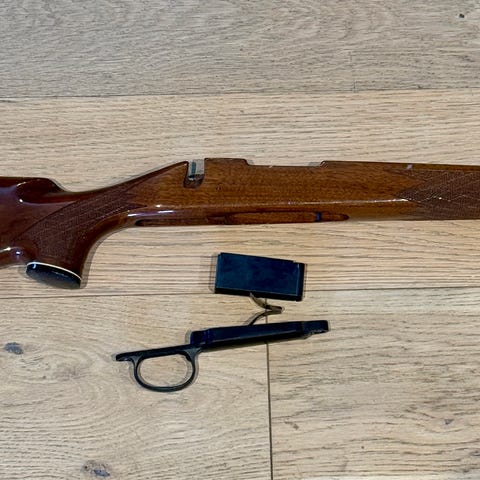 Pent våpen,påsatt original Remington laminat stokk uten hengslet magasin bunn,dvs tett under.