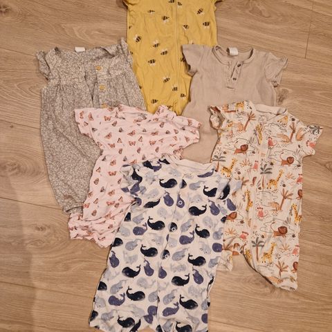 Fem kortermede pysjer selges samlet for 100 kr. Pent brukt. Ole Brumm-pysjen har fått litt gul misfarging omkring knappene (se bilder), ellers ingen anmerkninger.