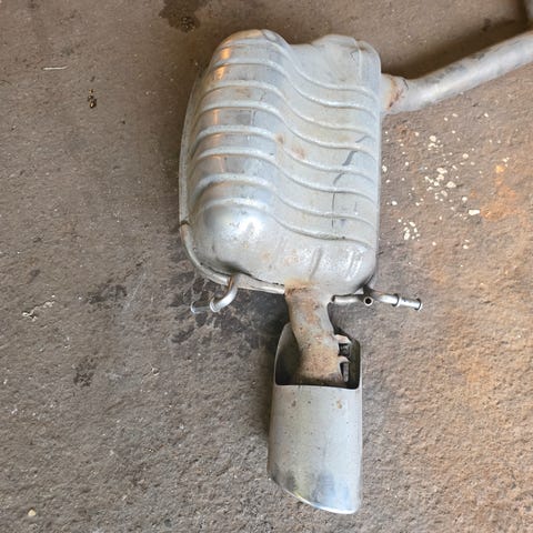 Saab eksosanlegg med lyddemper. Delen består av rør og lyddemper med opphengsfester. Stått på en Saab 900 79 mod. Passer vel også Saab 99. Se bilder for utforming, tilkoblingspunkter og generell tilstand før montering på kjøretøy.