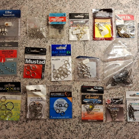 Selger samlet 65 sterke splittringer fra Berkley, Balzer og Midnight Moon. Alle splittringene er beregnet for å tåle stor fisk på havet. De er i størrelser 5, 6 og 10, med bruddstyrke på 18 kg (de tre pakkene i midten), 28 kg (til høyre), 36 kg, (de 4 splittringene til venstre og fra Berkley) og 100 kg (de ni grove ringene nederst). Alt er nytt og ubrukt.