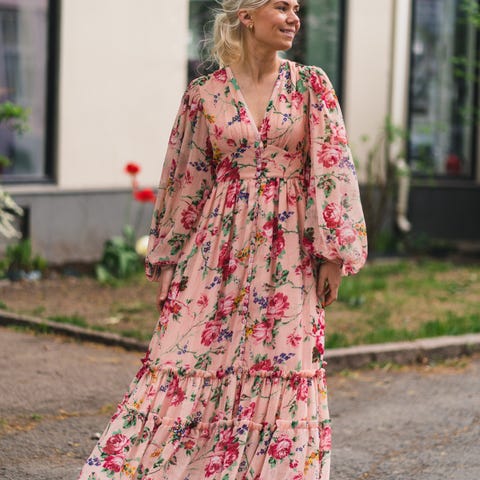 Fra nett: Chiffon Maxi Dress New York Blossom fra By Timo. Vakker maxi-kjole i lett og deilig chiffon-kvalitet, og med et helt nydelig blomsterprint. En perfekt kjole til bryllup eller andre festlige anledninger.