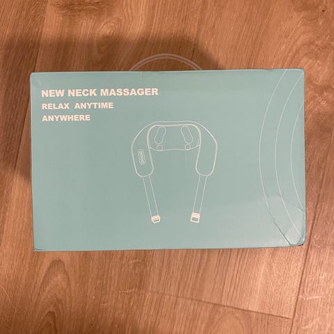 Neck & Shoulders Massager nakk- og skuldermassasjer apparat. Oppladbar massasjemaskin for nakke og skuldre med to hastighetsinnstillinger og varmefunksjon. Utformet som en krage som legges rundt nakken. Egnet til bruk hjemme for punktmassasje av nakke- og skulderparti. Drives av innebygd oppladbart batteri og lades via medfølgende kabel (ifølge originalemballasje). Brukt en gang