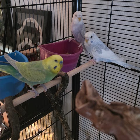 Selger et par knarifugler mosaic med stor brukt bur og utstyr som tilhører har en del mat.