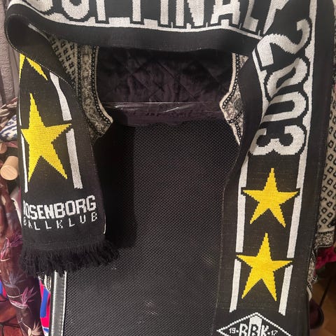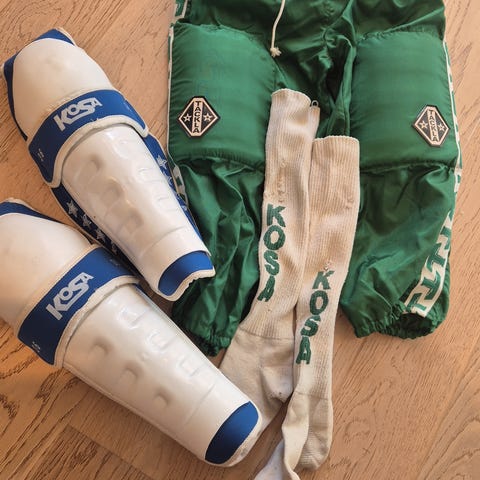 Pakke med bandy utstyr fra Snarøya Pink Panthers. Pakken består av bukse, trøye, gamasjer, skjerf og buff. Trøyen er godt brukt og har noen flekker ved halspartiet. Ellers er tingen i veldig god stand.
