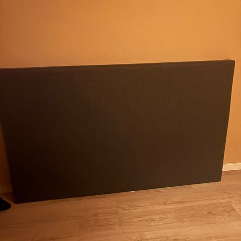 Er trukket i lyst linstoff. Kan trekkes om. Passer til seng på 160 cm.