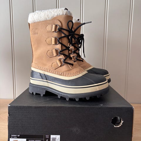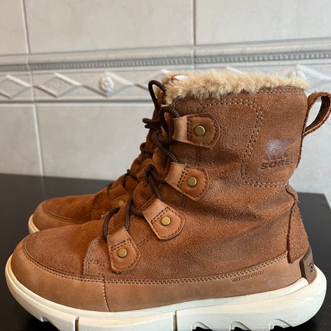 Helly Hansen vinterstøvler i størrelse 41. Støvlene er i brun farge med kraftig yttersåle og snøring foran. Overdelen er i et robust materiale med forsterket parti rundt sålen. Innvendig er støvlene fôret med mykt, lyst fleecefôr for ekstra varme. Egnet som vintersko til hverdagsbruk og uteaktiviteter i kaldt vær.