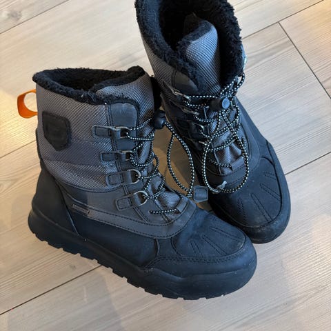 Vinterstøvler for barn i størrelse 36. Unisex-modell i svart med grov såle for godt grep. Støvlene har høy skaft, snøring og polstret innside for økt komfort. Egnet som vintersko til hverdagsbruk og uteaktiviteter i kaldt vær.