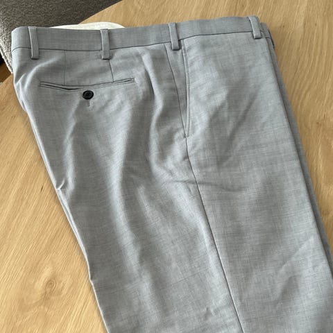 Dressmann dressbukse for herre i størrelse 34-32 Buksen er grå og laget av polyester. Den har beltehemper i livet, glidelås og knappelukking foran. Det er skrålommer i sidene og to baklommer med knapp. Passer som penbukse til jobb, hverdag eller formelle anledninger. Ikke Slim fit.