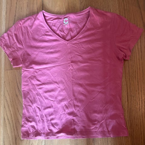 Toppen er i en nydelig pastellrosa farge, med flatterende v-utrigning og med en dekorativ logo på ermet i stener.