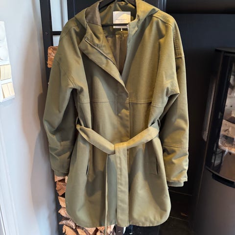 Fin, grønn regnjakke. Belte i livet, hette og praktiske magnetknapper til lukking i front.