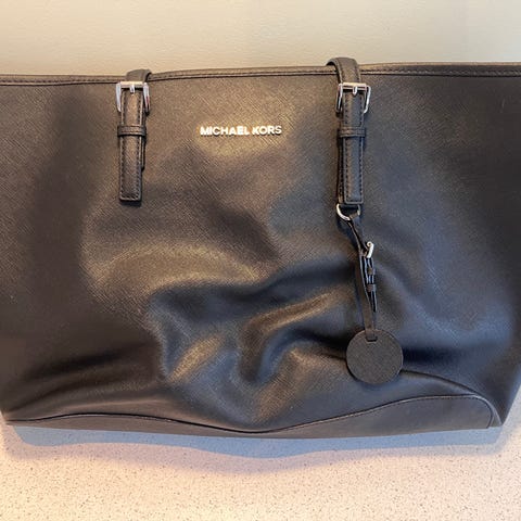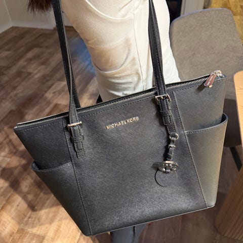 Vesken har doble skulderstropper med justerbare spenner og metall-detaljer i gullfarge, inkludert MK-logoanheng. Overflaten er i strukturert lær. Passer som hverdagsveske eller til jobb, med god plass til personlige eiendeler. Innvendig inndeling og lommer kan brukes til organisering av mindre ting som nøkler, mobil og lommebok.