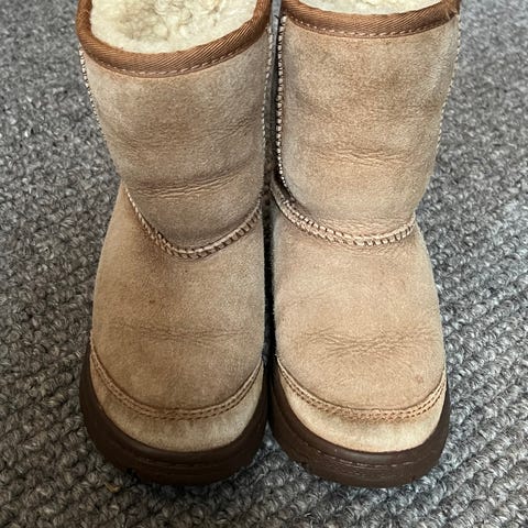 Støvler i lammeskinn i størrelse 28. Støvlene er i brun farge med mykt, fôret innside som gir god varme rundt foten. Yttermaterialet fremstår som semsket og har en klassisk UGG-fasong (er ikke av merket UGG) med skaft opp mot leggen. Lett å ta av og på.